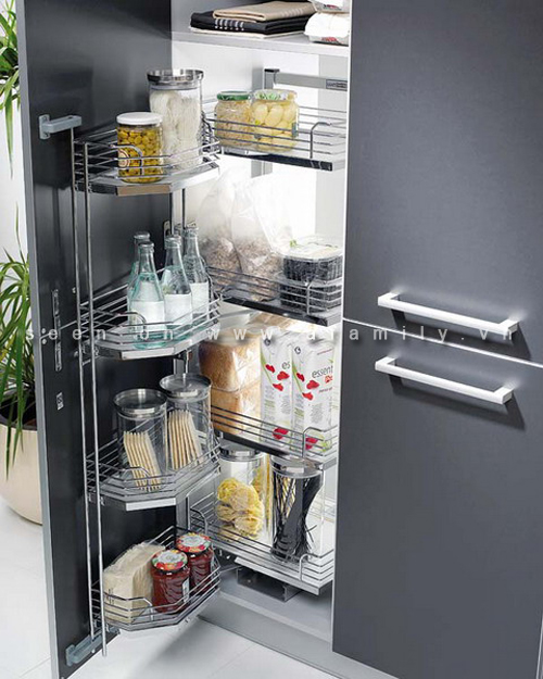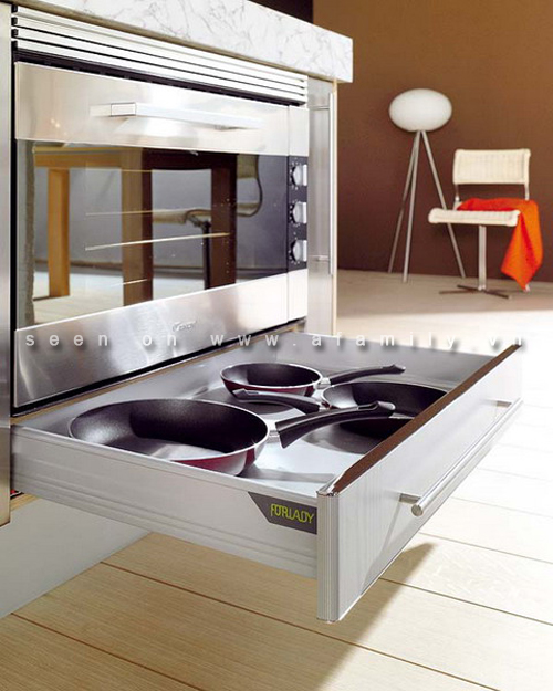 Trong các đơn vị lưu trữ trên đây bạn đã thấy yếu tố trượt được khai thác rộng rãi. Nhưng ở đây các chức năng thích nghi khác cũng có thể được sắp xếp bên trong các lưu trữ trượt của nhà bếp.