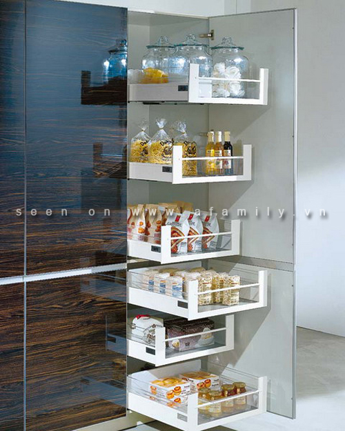 Dưới đây là những phương pháp nhỏ gọn để sắp xếp vị trí phức tạp cho việc lưu trữ trong nhà bếp hoặc bên cạnh nó. Một trong hai nguyên tắc thường được sử dụng là Trượt với các hộp trong một khối thống nhất hoặc mở rộng theo hai cánh cửa đôi. Ngoài ra là cách gắn thêm hệ thống lưới lưu trữ trên cánh cửa để cung cấp gian chứa cho phụ kiện.