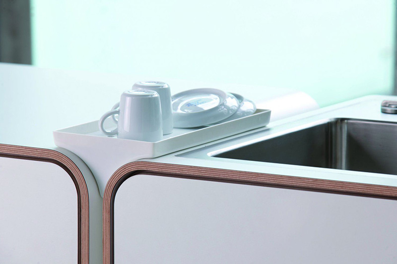 Mỗi mô-đun gồm một không gian bếp riêng, một chiếc kệ cao, một khu vực lưu trữ ở giữa và một chiếc kệ thấp hơn. Không gian ở giữa có thể chứa các thiết bị gia dụng như lò vi sóng hay máy rửa bát.