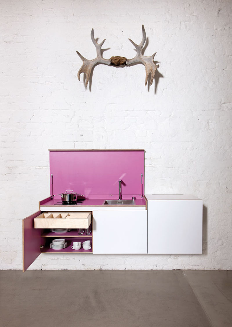 Phòng bếp thoắt ẩn thoắt hiện này là một phòng bếp tích hợp mà bạn có thể dấu đi bất kỳ lúc nào bạn muốn, ngụy trang nó giống như một chiếc tủ/bảng điều khiển gắn ở tường với kiểu dáng đẹp. Thiết kế mô-đun thông minh và dễ ứng dụng, đặc biệt được tạo ra cho những không gian nhỏ như những căn hộ studio mà thường không có phòng bếp riêng biệt.