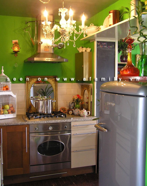 Đây là một trong những thiết kế dành cho nhà bếp nhỏ một cách khác vui nhộn và sống động. Bức tường sơn màu xanh lá trẻ trung, đèn chùm sáng rực màu vàng, lại được đặt thêm một tấm gương ngay chính giữa.