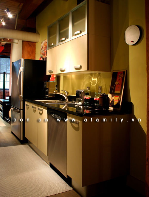 Đây quả là một không gian nhỏ, vậy làm sao để có thể thiết kế? Những hộc tủ ở dưới và một bộ tủ được đặt trên tường sẽ giúp bạn tận dụng không gian tối đa. Bạn hãy nhìn màu sắc, tông màu đất tạo nên sự tương phản nhẹ với chiếc tủ lạnh và mặt bếp màu đen, cùng với chiếc tủ có tông màu sáng hơn. Trần nhà cao sẽ làm giảm bớt không gian hẹp của bếp.
