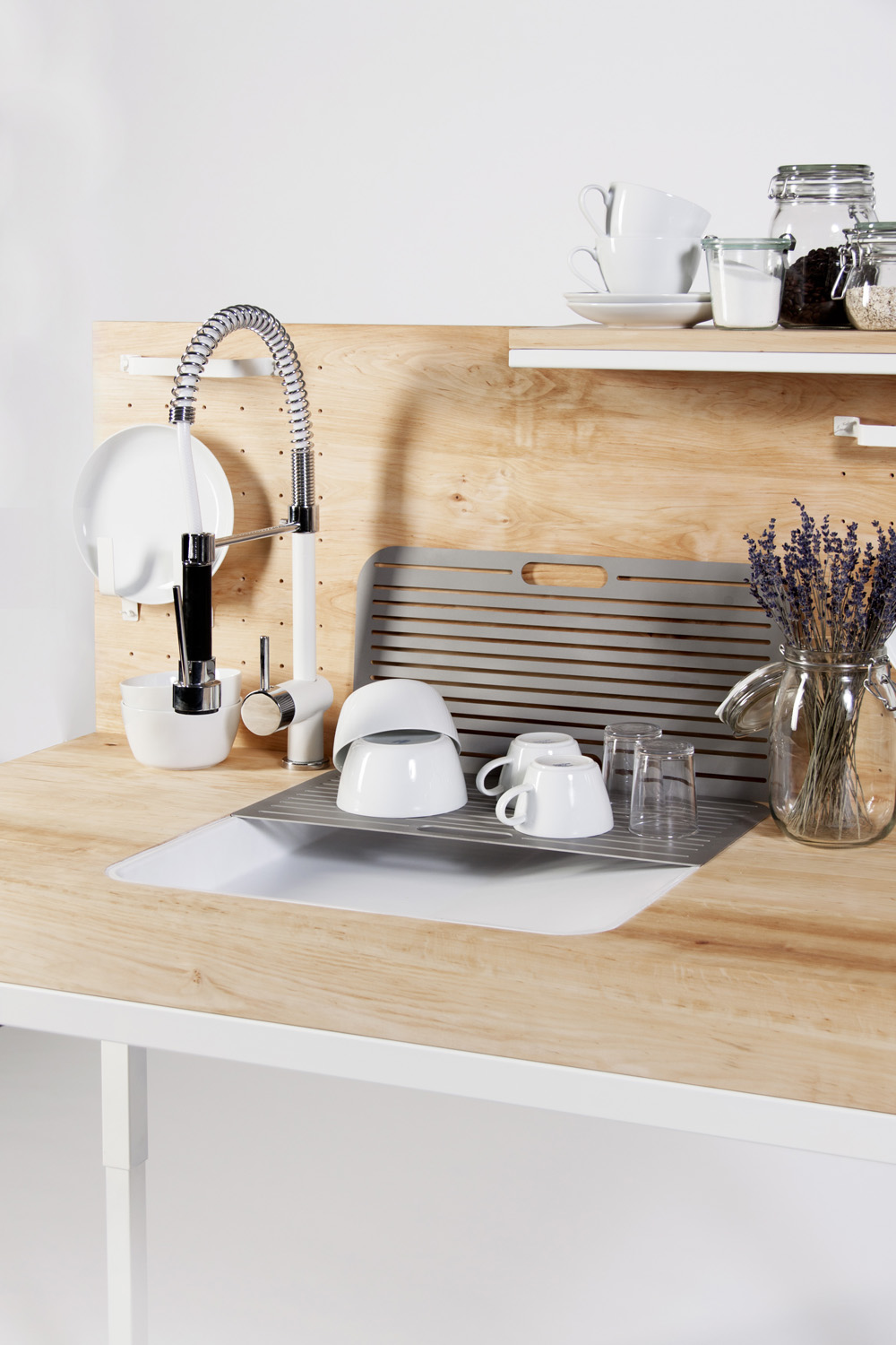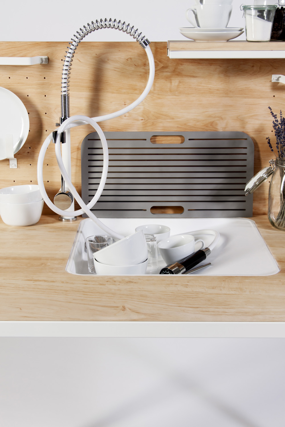 Các lỗ nhỏ được đục trên mặt phẳng vuông góc với bồn rửa được sử dụng tùy ý. Bạn có thể tạo các móc treo để treo vật dụng giúp căn bếp gọn gàng, thông thoáng.