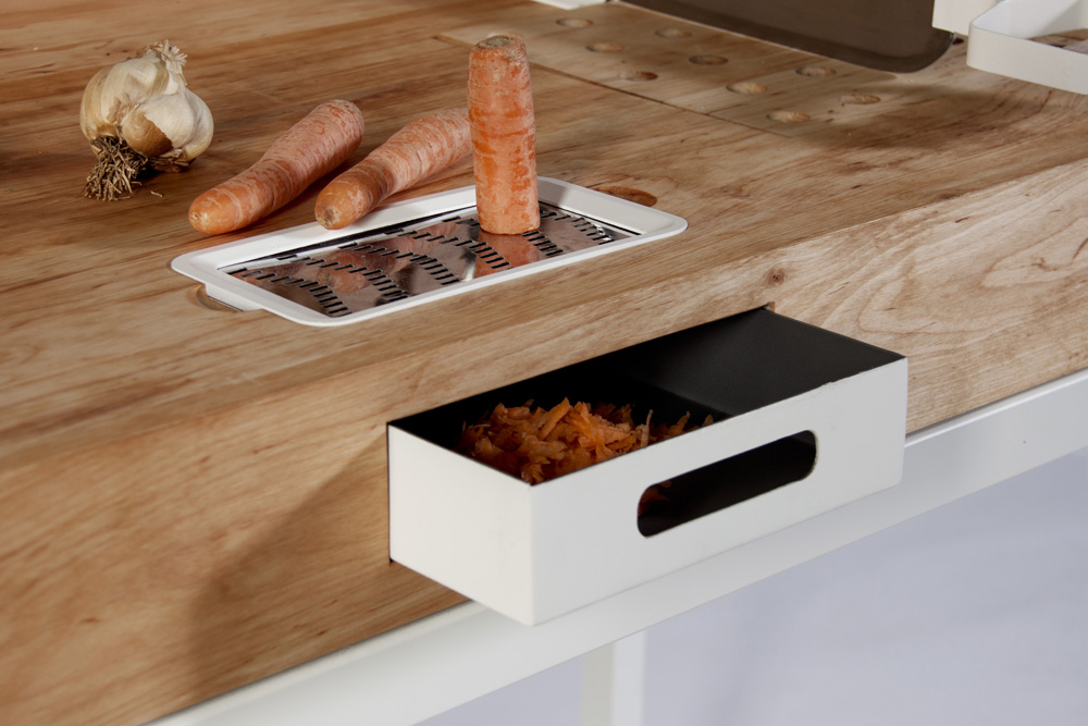 Mặt bàn bếp được bố trí nhiều tính năng tiện lợi cho việc chuẩn bị đồ ăn và nấu nướng, giúp bạn hạn chế việc mua vật dụng hay bày biện lộn xộn trên bàn. Nơi gọt rau củ quả và ngăn kéo đựng đồ đã gọt xong.
