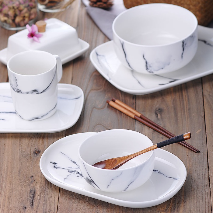 7. Đĩa và bát bằng gốm sứ nhưng được mô phỏng đường vân của đá tự nhiên đủ để không gian ăn uống thêm gần gũi và thân thiện.