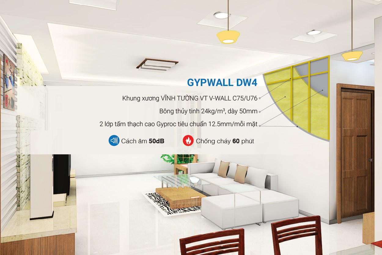 Hiện tại chủ nhà có thể lựa chọn nhiều giải pháp phù hợp với nhu cầu, tuy nhiên nếu để ngăn chia không gian cho nhà dân dụng, căn hộ chung cư nên sử dụng hệ giải pháp tường thạch cao Gypwall DW4. Cấu tạo bao gồm khung xương Vĩnh Tường, 2 lớp tấm thạch cao tiêu chuẩn Gyproc 12.5mm mỗi mặt kèm bông thủy tinh có khả năng cách âm lên đến 50dB và chống cháy 60 phút.