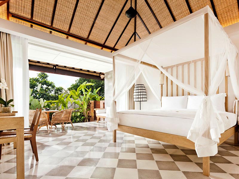 Sự kết hợp giữa chất liệu gỗ tự nhiên và rèm vải mỏng mang đến không gian phòng ngủ cảm giác bình yên vô cùng.