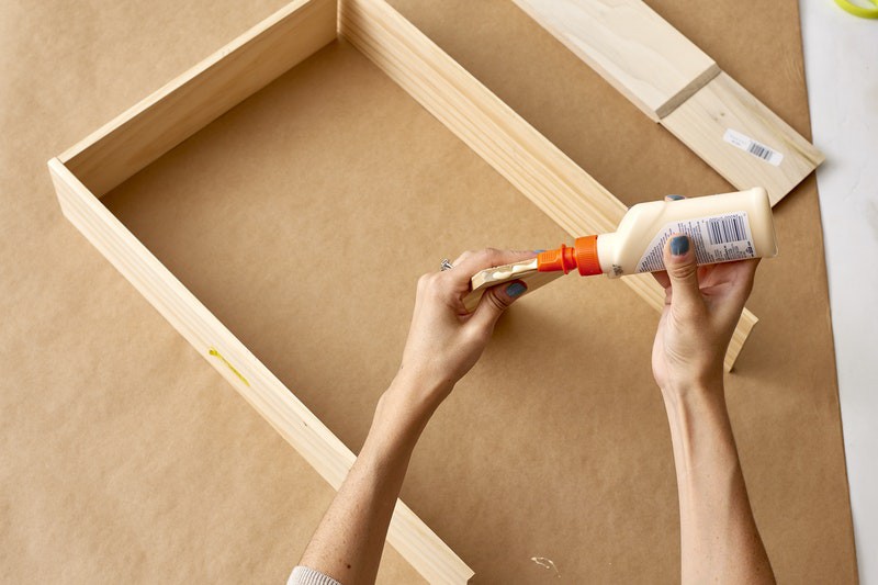 4. Gắn khung lại với nhau: Sử dụng keo dán gỗ, lắp ráp khung để các miếng ở góc 90 độ. Đặt khung sang một bên để khô.